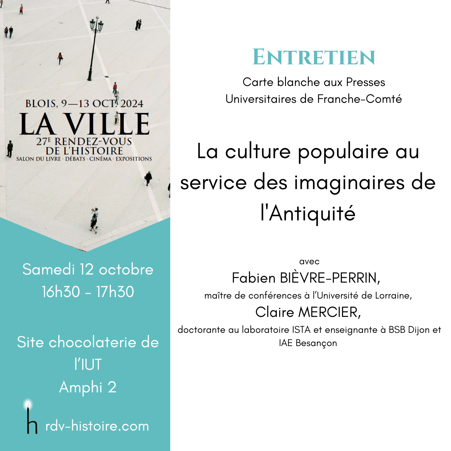 Claire Mercier doctorante à l'ISTA et Fabien Bièvre-Perrin MCF Université de Lorraine donneront une conférence lors des Rendez-vous de l'Histoire à Blois le samedi 12 octobre à propos de la culture populaire au service des imaginaires de l'Antiquité. Ils présenteront notamment l'ouvrage collectif qu'ils ont dirigé et récemment publié par les PUFC collection ISTA "Jules César, la construction d'une image de l'Antiquité à nos jours".