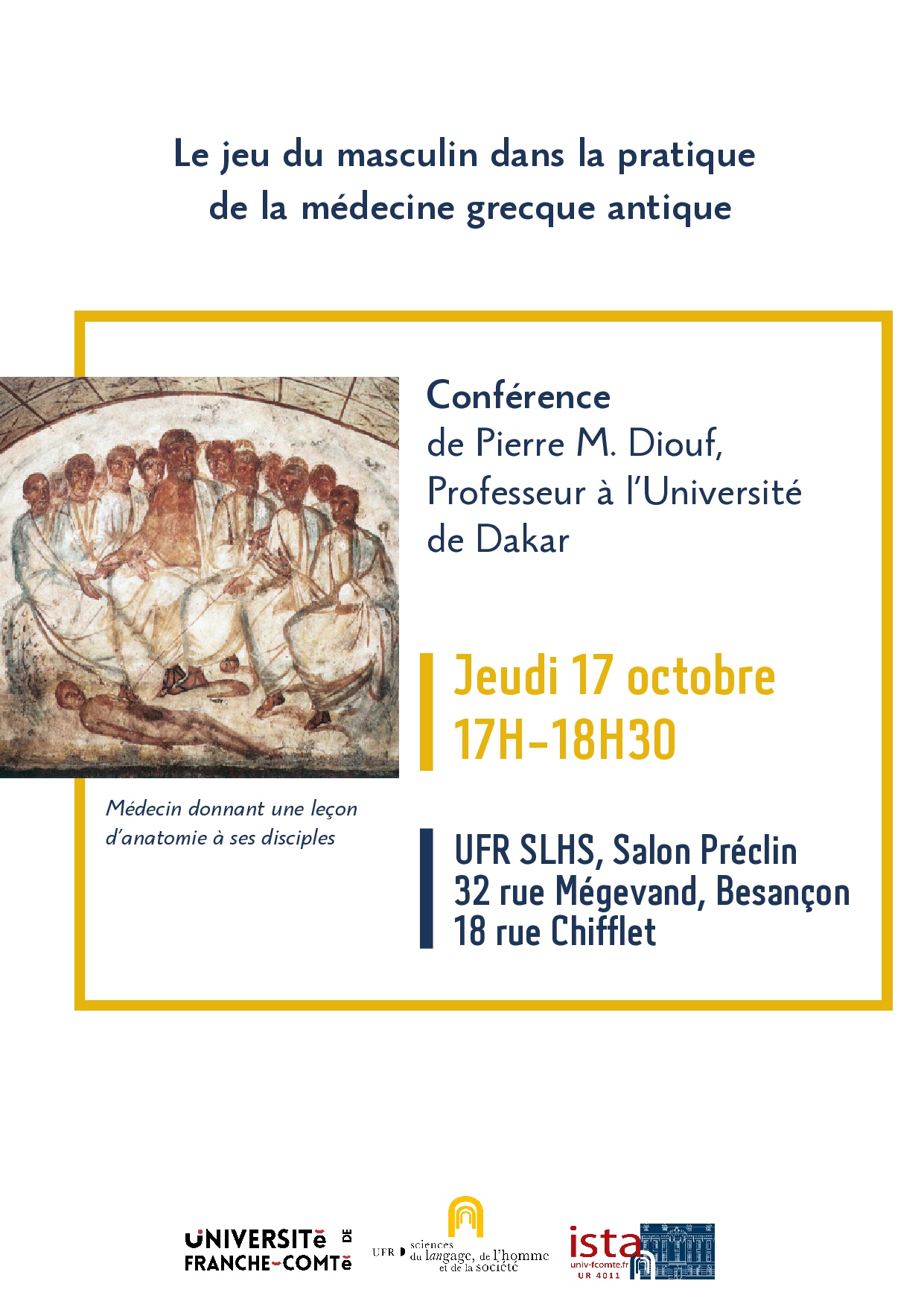 le jeudi 17 octobre au Salon Préclin de 17h à 18h 30 : Pierre M. Diouf, maître de conférences à l'Université de Dakar, " Le jeu du masculin dans la médecine grecque antique"