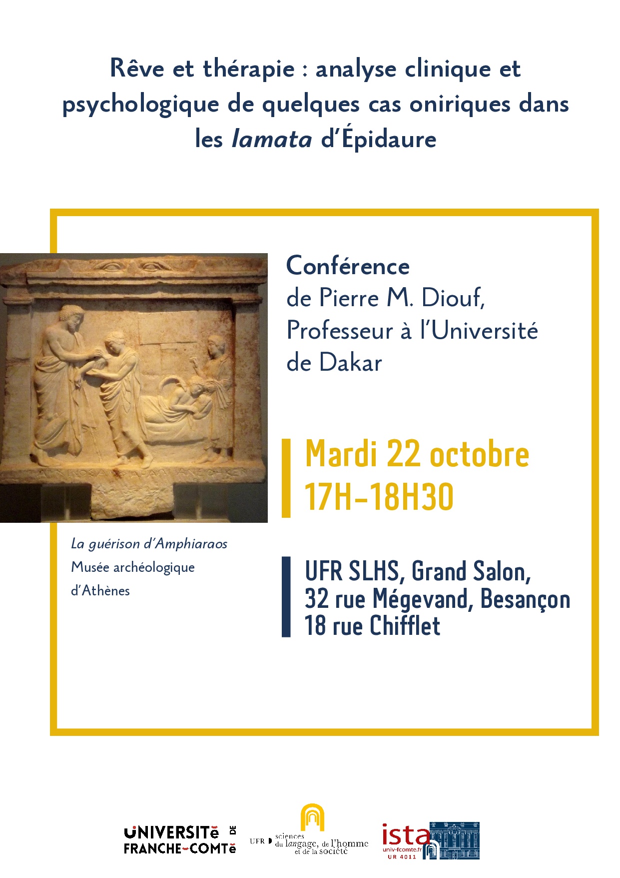 mardi 22 octobre au Grand Salonde 17h à 18h 30 : Pierre M. Diouf, maître de conférences à l'Université de Dakar, "Rêve et thérapie : analyse clinique et psychologique de quelques cas oniriques dans les Iamata d'Épidaure"