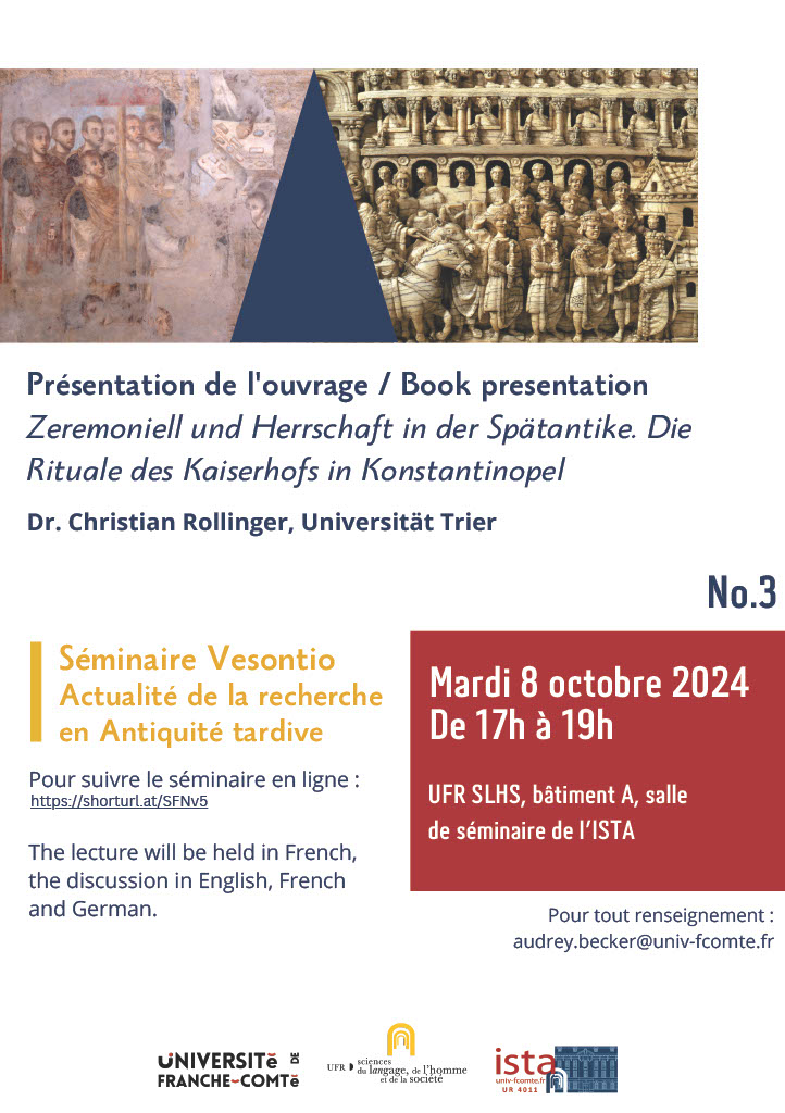 Pour cette 3ème séance du séminaire Vesontio, Actualité de la recherche en Antiquité tardive, nous aurons la chance d'accueillir le 8 octobre 2024 Christian Rollinger (Universität Trier) qui nous présentera son dernier livre. N'hésitez pas à vous joindre à nous sur place ou en ligne! La conférence aura lieu en français, la discussion en français, anglais ou allemand.