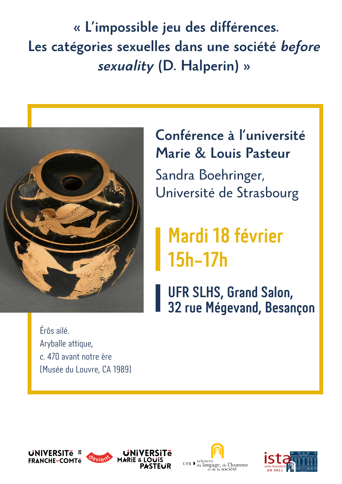 Mardi 18 février de 15h à 17h au Grand Salon : Sandra Boehringer (Université de Strasbourg) : « L’impossible jeu des différences. Les catégories sexuelles dans une société before sexuality (D. Halperin) »
