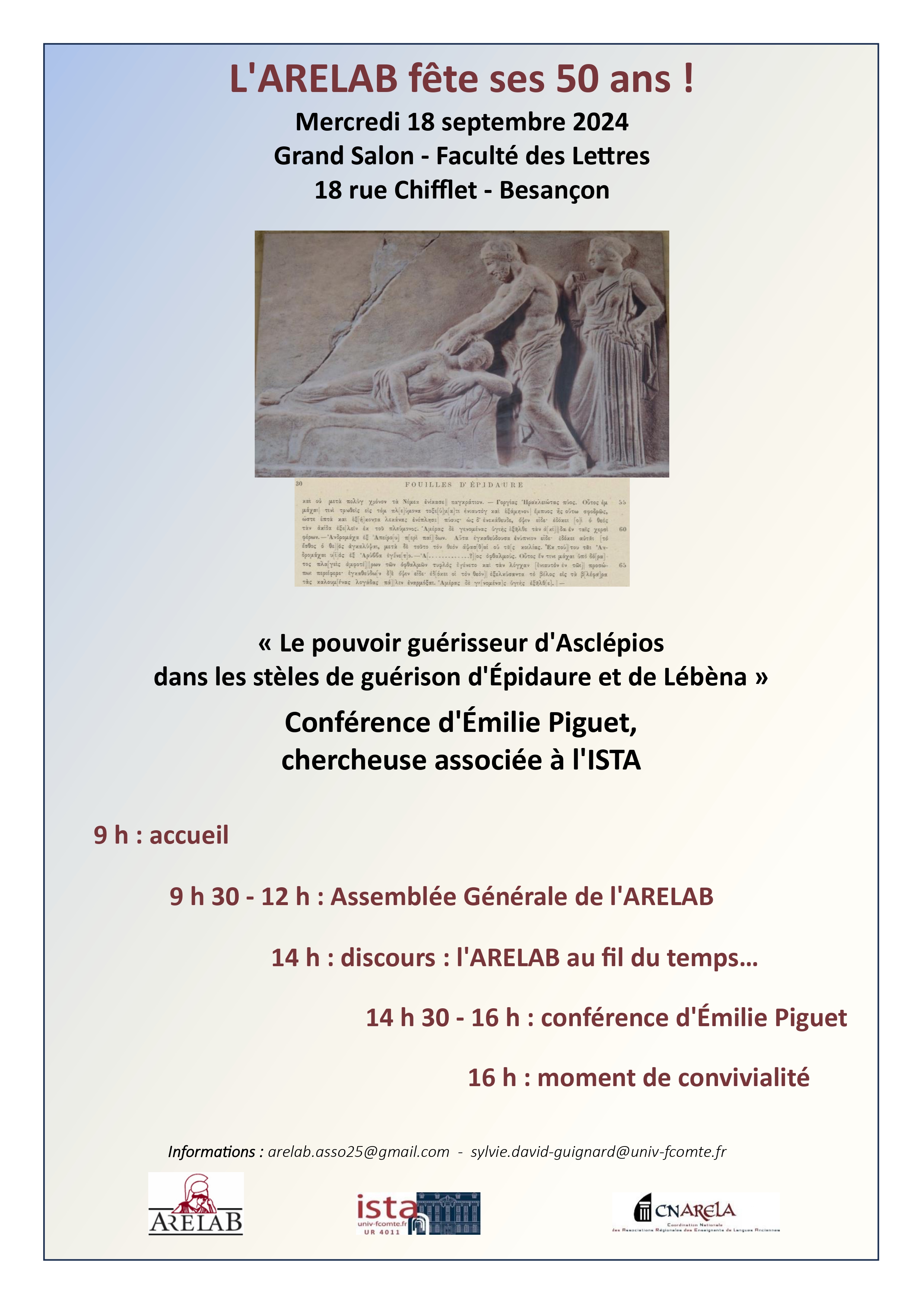 L’après-midi débutera à 14h par des discours qui évoqueront le rôle historique de l’Association ; puis de 14h30 à 16h, Émilie Piguet, docteure en histoire ancienne et chercheuse associée à l’ISTA, donnera une conférence sur « le pouvoir guérisseur d’Asclépios dans les stèles de guérison d’Épidaure et de Lébèna » ; enfin, l’après-midi se conclura à partir de 16h par un pot amical.