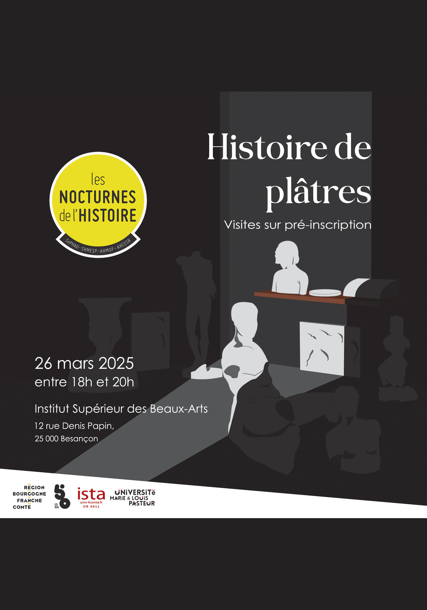 À l'occasion des Nocturnes de l'Histoire, nous proposons de faire découvrir au public le projet d'étude des collections de plâtres de Bourgogne - Franche-Comté, mené depuis 2014 par deux enseignantes-chercheures de l'université Marie et Louis Pasteur (anciennement université de Franche-Comté) et de l'université de Bourgogne - Europe et leurs étudiants. Les plâtres sont des copies de statues et reliefs célèbres, ou des créations à visée pédagogique, qui accompagnaient dans les écoles d'art les cours de dessin, de modelage, de sculpture ; dans les universités, ils permettaient aux étudiants de découvrir les formes artistiques en trois dimensions.