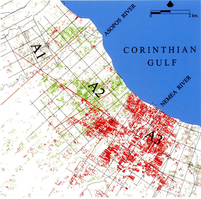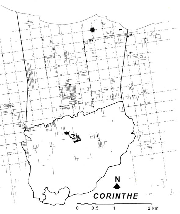 Dans le secteur Nord de Corinthe, l'orientation du système se situe approximativement à 90° nord-ouest. Des éléments ont été localisés grâce à des cartes aériennes datant de 1962. Ces éléments sont par exemple des limites de champs ou de propriétés, ainsi que des routes. Ces restes révèlent une organisation caractérisée par des parcelles longues, étroites et mesurées à 275 et 550m environ.