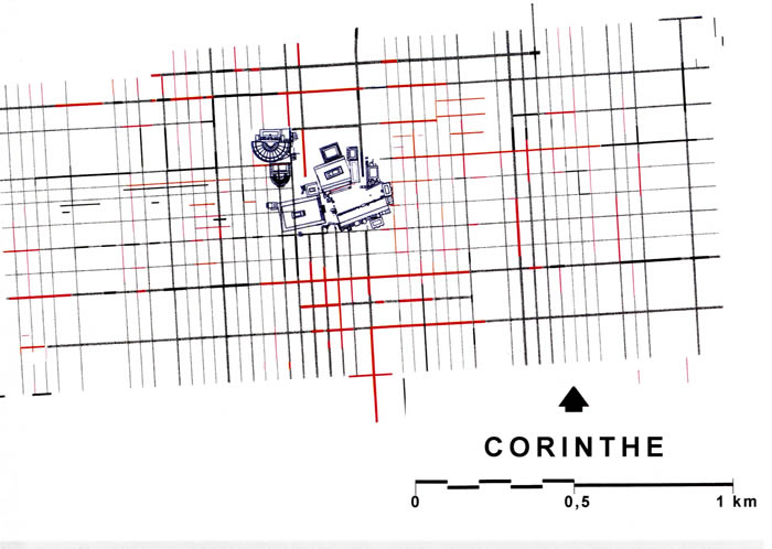 La "Colonia Laus Iulia Corinthiensis", centuriation datant de 44 av. n. è., a laissé des traces de maillage urbain visibles en vue aérienne. Ces traces ont pu être reconstituées grâce aux fouilles. Ainsi les lignes noirs présentes sur le plan indiquent les traces visibles sur photos aériennes, les lignes rouges indiquent les traces de chemins et les lignes bleues les traces de bâtiments et routes fouillés.