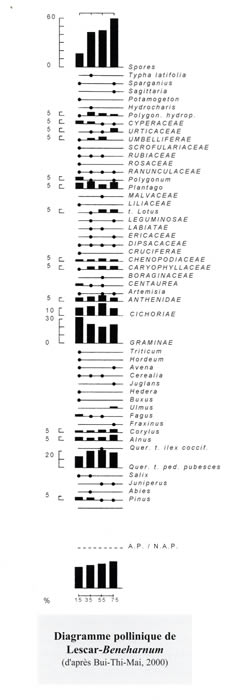 Les analyses palynologiques montrent un espace où les zones de pacage et de cultures permanentes s'alternaient. Au Ier s. de n. è., un échantillon provenant du fossé marquant la limite de l'aire urbaine de "Beneharnum" à l'Ouest montre l'introduction, contemporaine de la naissance du site urbain. On y trouve des cultures nouvelles (blé, orge). Et près du campement de Lanusse, un autre prélèvement semble montrer la présence d'espaces de culture et d'espaces de pâturage.