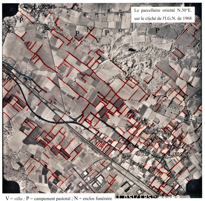 Sur un secteur d'environ 8km², entre Lescar et Lons, des clichés aériens de l'IGN, ont permis de montrer l'existence d'un parcellaire orienté Nord 30° Est. Ainsi, les vestiges d'un cadastre antique ne peuvent être exclus. L'orientation du parcellaire semble correspondre à la première phase d'aménagement de la voirie urbaine antique, du quartier du Bialé à Lescar, datée par la fouille à la première moitié du Ier s. de n. è.