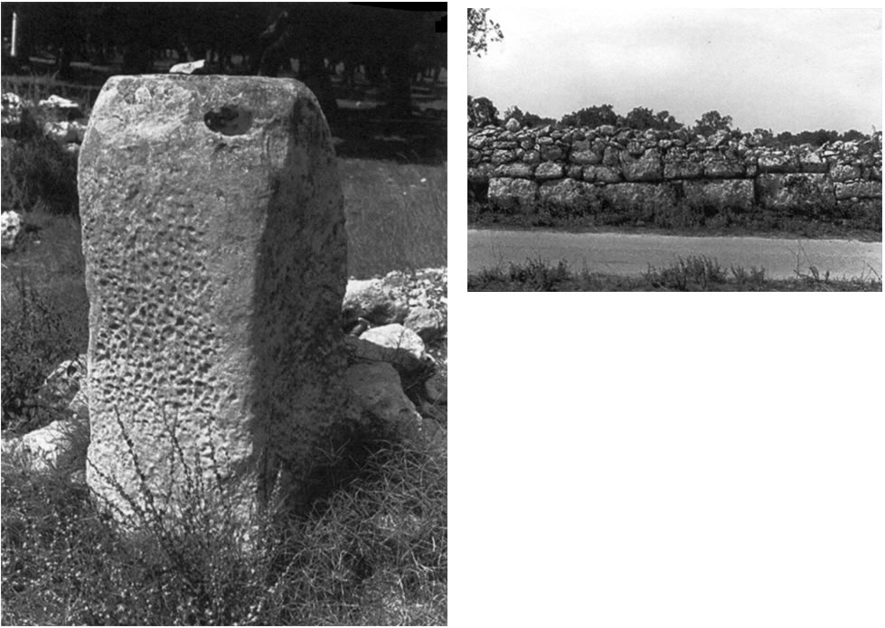 Plusieurs dolmens et menhirs hérités des cultures messapiennes et sallentines ont été récupérés ("consuetudo loci") comme élément de limitation ou ont servi de modèle pour la fabrication des bornes romaines locales.