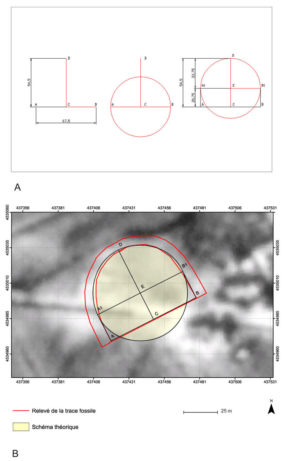 Elle pourrait indiquer de façon approximative les partitions essentielles à l'intérieur du monument d'Atella. Le resultat de la superposition du schéma théorique à la trace photographique est très éloquent et constitue un élément àl'appui de l'interprétation de l'édifice comme un théâtre (figure B).