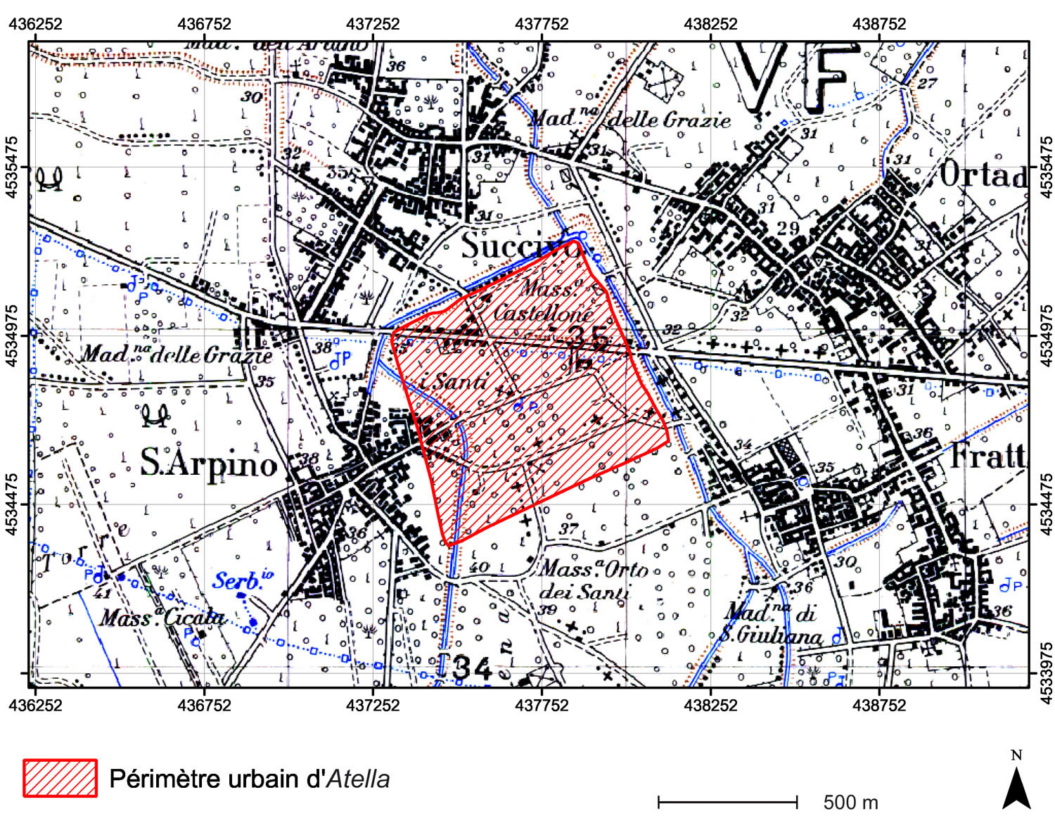 Commentaire | Le site d'Atella est localisé à l'Est de la ville actuelle de S. Arpino, où une denivellation altimétrique définit les contours d'un plateau (la "terrasse"), qui correspond au plan de l'habitat antique. Le périmètre urbain, défini par la dénivellation a une forme trapézoïdale et contourne une surface de 43 hectares environ. La fortification de l'espace urbain avait été réalisée dans la deuxième moitié du IVème ou au début du IIIème siècle av. J.-C. avec un large fossé et des remparts en blocs parallélipipèdiques de tuf, unis sans mortier, documentés archéologiquement sur la lignes du périmètre méridional. |
