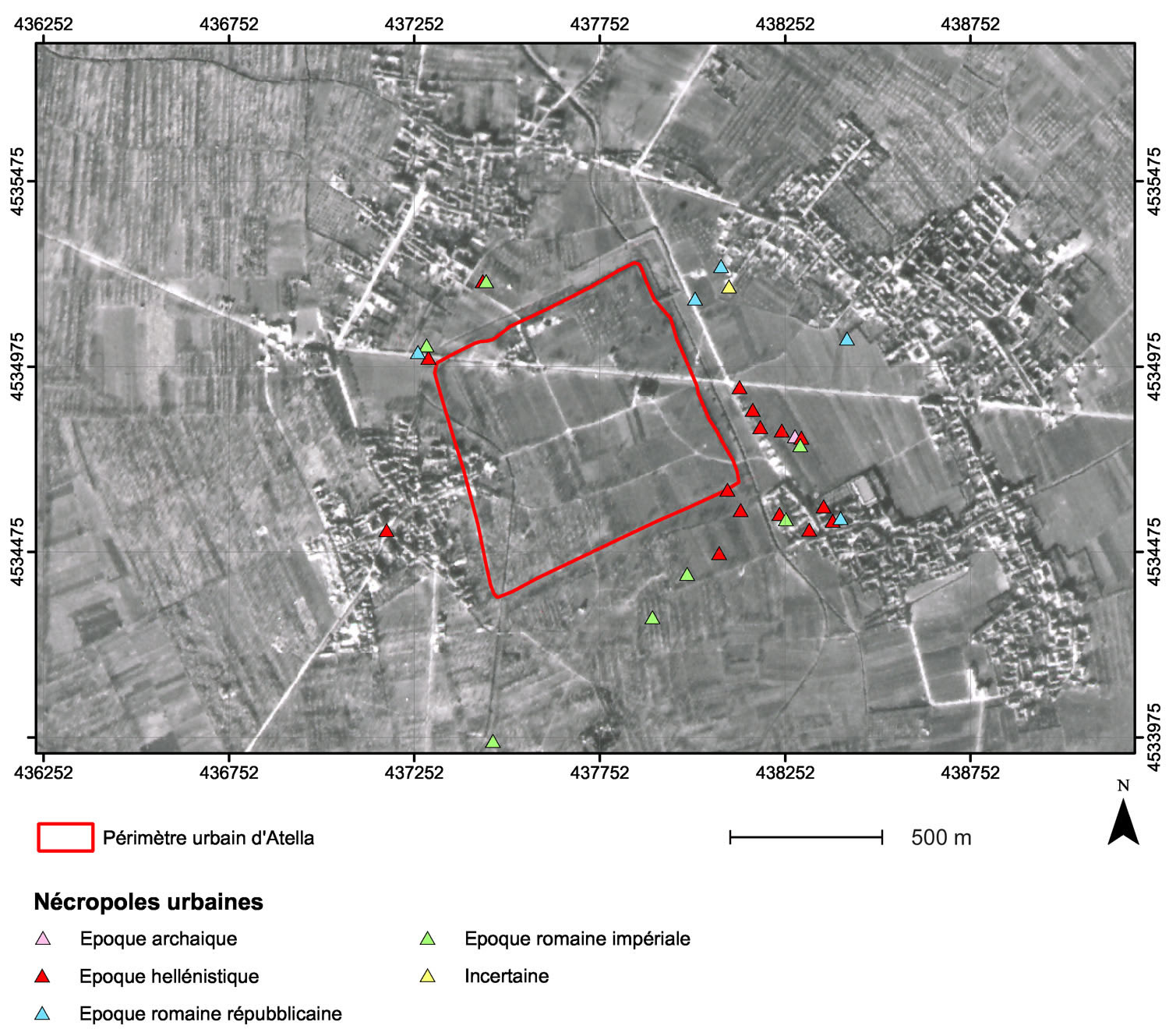 - Ager Campanus. Relevé des traces conforme à l'orientation du réseau routier urbain d'Atella en Campanie (photographie aérienne vol USAF, 22 JAN 1957, F 183/184 St. 1, pos. 10, cliché n. 271444)