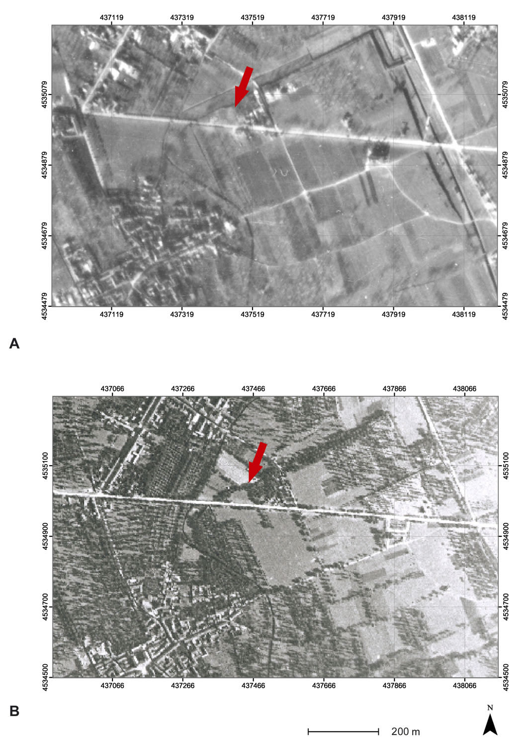 A : Sur les photogrammes du vol USAF 1957, réalisés dans la saison d'hiver, la trace du théâtre se révèle sous forme de différences de tons, sur un terrain dénué du manteau végétal ; le phénomène dépend de la formation de zones à contenu d'humidité différencié.