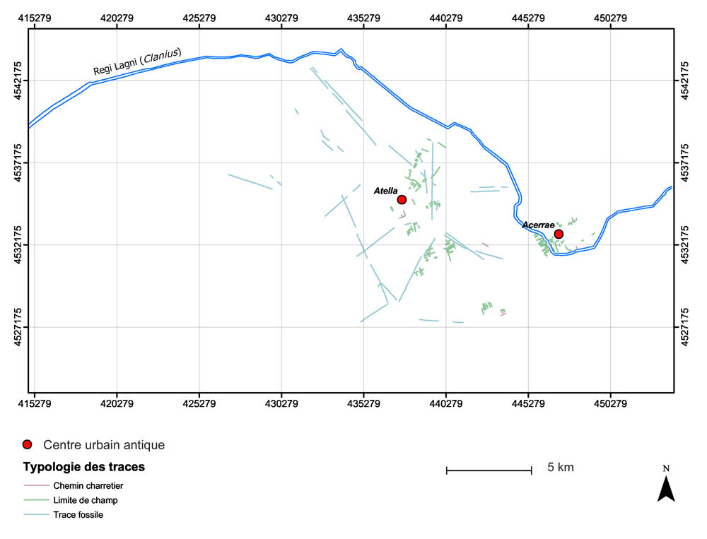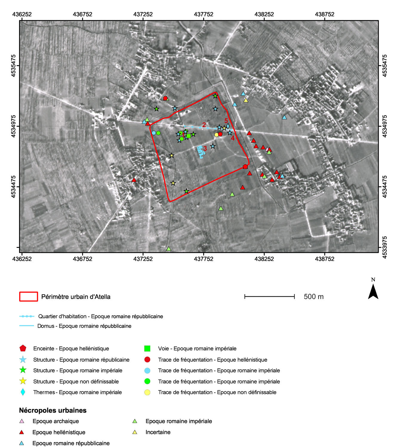 Pour l'époque comprise entre la fin de la Republique et le début de l'Empire, la prospérité attestée par les sources littéraires trouve une confirmation dans la documentation archéologique, qui montre, pour cette période, une phase d'expansion et de restructuration dans le secteur oriental de la ville. Ici, des recherches effectuées en 1982 tout au long de la route départementale Caivano-Aversa (secteur 2) ont permis de découvrir de nombreuses fosses pratiquées pour l'extraction de la pouzzolane et remplies avec des matériaux de construction et de la céramique, dont la datation varie entre l'époque hellénistique avancée et le Ier siècle ap. J.C. En outre, des restes d'habitation furent découvertes ; les structures étaient orientées selon les tracés supposés des routes antiques et elles étaient caracterisées par des mesures toujours exprimées en pieds romains.