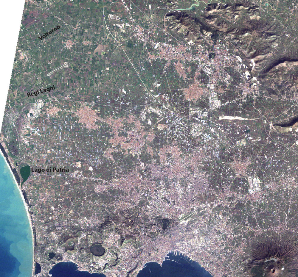 La plaine campanienne est bordée, de l'Est au Nord-Ouest, par des massifs montagneux, à savoir les Monti Tifatini, le Monte Maggiore, le volcan éteint de Roccamonfina et le Monte Massico. A l'Ouest la plaine atteint la bande côtière ; au Sud elle est délimitée par les modestes élévations des Champs Phlégréens, et, plus à l'Est, par les pentes du Monte Somma. Le territoire ainsi délimité est traversé par deux cours d'eaux principaux : au Nord le Volturno qui nait dans le Samnium septentrional et forme le bassin hydrographique le plus étendu de la région ; au Sud les Regi Lagni, système de canaux artificiels réalisés dès la fin du XVIème siècle pour drainer le cours de l'ancien fleuve Clanius, qui prenait sa source aux pieds du Monte Vergine.