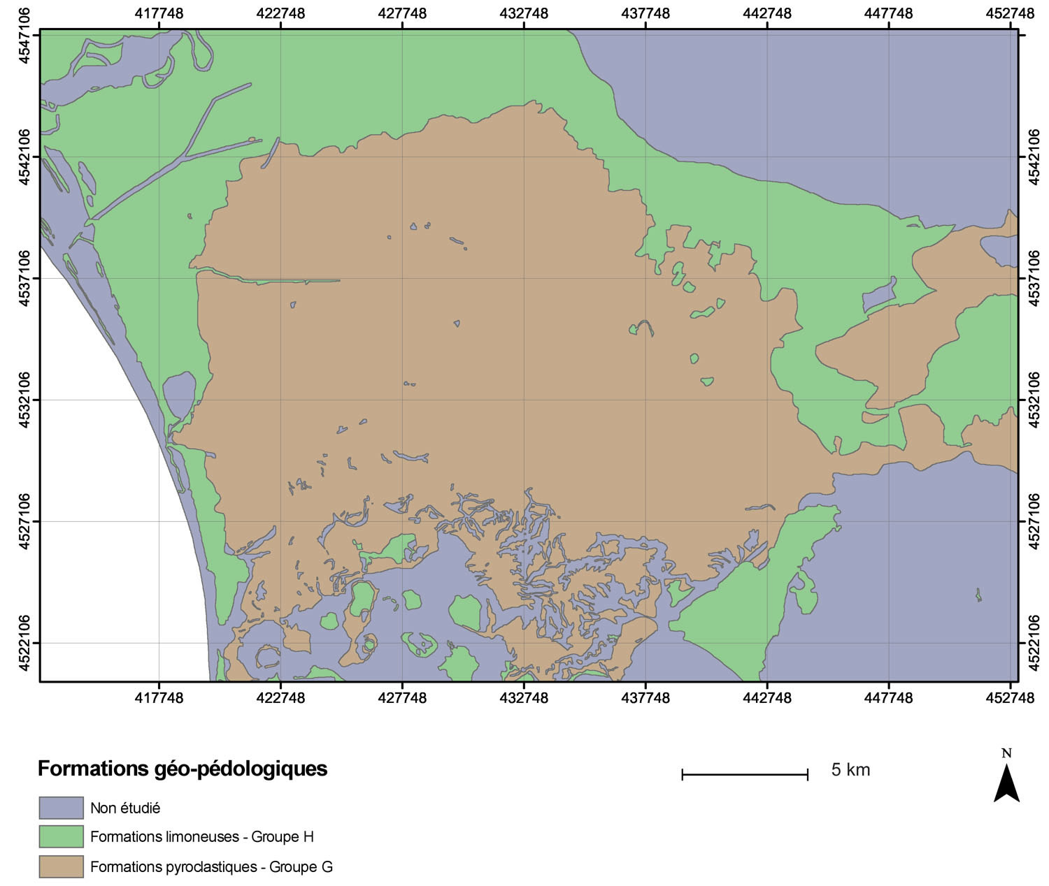 L'opération de croisement, effectuée à l'aide des fonctions d'analyse spatiale d'ArcGIS, a permis la création de cette carte qui divise la zone d'étude en deux grandes entités correspondant à deux classes de données géo-pédologiques : la classe des formations limoneurse et des sols du groupe H d'une part et la classe des formations pyroclastiques et des sols du groupe G de l'autre.