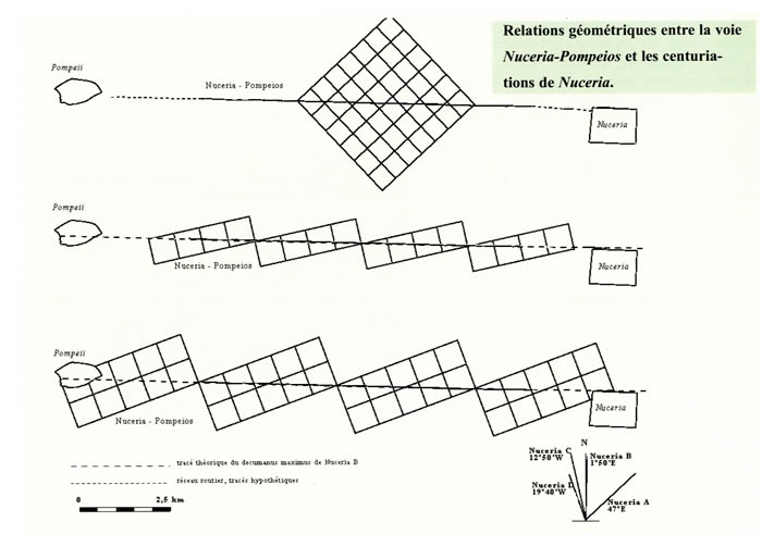 Commentaire | Il existe une relation géométrique entre la voie "Nuceria-Pompeios" et les centuriations de "Nuceria". En effet la route "Nuceria-Pompeios" sert d'axe de départ aux différentes centuriations. |
