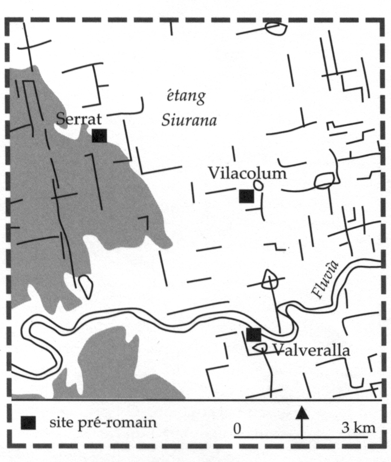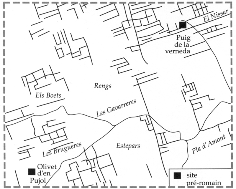 A proximité d'Emporion, les sites ruraux sont presques inexistants, comme si les terres proches de la "polis" étaient cultivées par les habitant du centre urbain. Il faut aller dans les secteurs de piémont, mais toujours dans l'orbite de plaines alluviales ou de valées fluviales, pour trouver la majorité des sites ruraux connus. L'emplacement de ce type de site plaide en faveur d'un rapport cohérent entre la distribution des habitats et les traces cadastrales. Ainsi à "Puig de la verneda" et à "Olivet d'en Pujol", deux sites pré-romains, l'insertion des vestiges dans la trame orthonormée est un gage de l'exploitation des terres dans un cadre bien marqué.