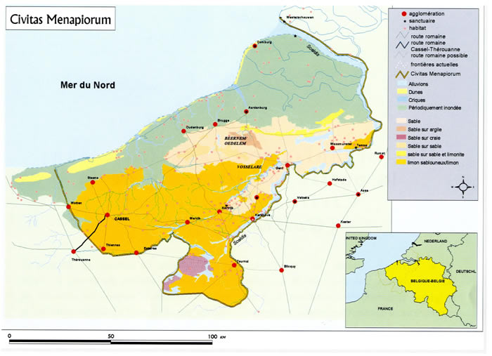 La "Civitas Menapiorum" recouvre des parties du Pas-de-Calais, du Nord-Ouest de la Belgique et la partie la plus occidentale du Sud des Pays-Bas. Au Haut-Empire, ce territoire est coupé en deux : le Nord est une région rurale et indigène et le Sud est plutôt romanisé, avec un petit centre urbain antique, Cassel, ainsi que des "villae". Pendant les premiers siècles de notre ère, Cassel était un carrefour viaire dense, avec un réseau de routes principales ; un centre administratif important entre la Manche et le Rhin. La meilleure preuve de l'importance de la ville sont des vestiges significatifs d'une présence militaire, du Ier s. de n.è. ainsi qu'au Bas-Empire.