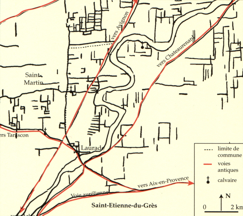 Au Nord d'Arles, dans la plaine qui s'étend entre les massifs de la Montagnette et des Alpilles, le réseau orienté entre NG 0°-3,5° O se prolonge avec une conservation différentielle des axes. Le relevé effectué sur la carte IGN à l'échelle 1/20 000 (levée de 1942, feuilles de Chateaurenard 5 et 6) présente la structuration du parcellaire dans la région de Saint-Etienne-du-Grès. On remarque la relation que la voie d'Arles à Avignon entretenait avec le maillage cadastral ainsi que la pérennisation de deux axes en limite de commune, et l'inscription de calvaires dans le réseau -en de nombreux points de la limitation ils indiquent un carrefour de "limites".