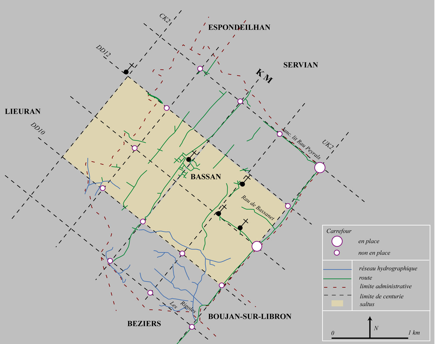 Dans la lecture des formes résiduelles et la restitution des formes anciennes, le rôle du marquage symbolique - limites administratives ou signes culturels - est essentiel. Au Nord de Béziers, dans la commune de Bassan, le rythme de la matrice centuriée se lit encore dans la limite communale qui suit largement l'orientation et l'orthogonalité du cadastre romain. Chemins et croix mémorisent aussi la métrique presque exacte du "saltus", ce bloc de quatre centuries définie par Varron (R. R. I, 10).