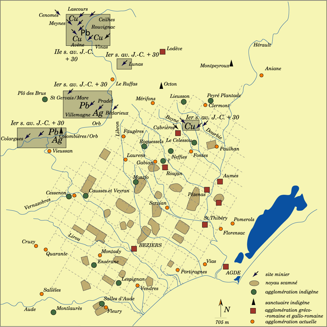 L'implantation du réseau met en évidence un problème de structure. On a reconnu deux ensembles calés sur les deux tronçons isoclines de la domitienne, à l'Ouest et à l'Est de la "pertica". Le second est decalé de 4 centuries vers le Sud après la traversée et le franchissement de l'Hérault. Outre cette différence - qui mesure un "saltus" de 4x4 centuries, reconnaissable ailleurs dans le réseau, on note plusieurs décalages ou approximations. Si la variation angulaire (1/2 degré environ) est négligeable, les axes eux-mêmes ne se retrouvent pas dans un alignement exact, "kardines" et "decumani" théoriques étant respectivement décalés d'environ 1/3 et 1/4 de centurie. Faut-il voir dans l'articulation des deux arpentages sur la vallée de l'Hérault deux opérations conduites par deux équipes techniques mal coordonnées, selon la mauvaise réputation des arpenteurs de province ? Ou deux phases, successives, mais proches, de division et d'assignation, ce qui supposerait soit un apport de nouveaux colons, que rien ne permet de supposer, soit plutôt une extension du territoire colonial. Il parait, en effet, raisonnable de constater l'appartenance structurelle à la colonie de Béziers qui englobe outre les terres des "oppida" latins ou pérégrins, celles de l'agglomération d'Agde en un seul système, peut-être fait de deux ensembles coordonnées.