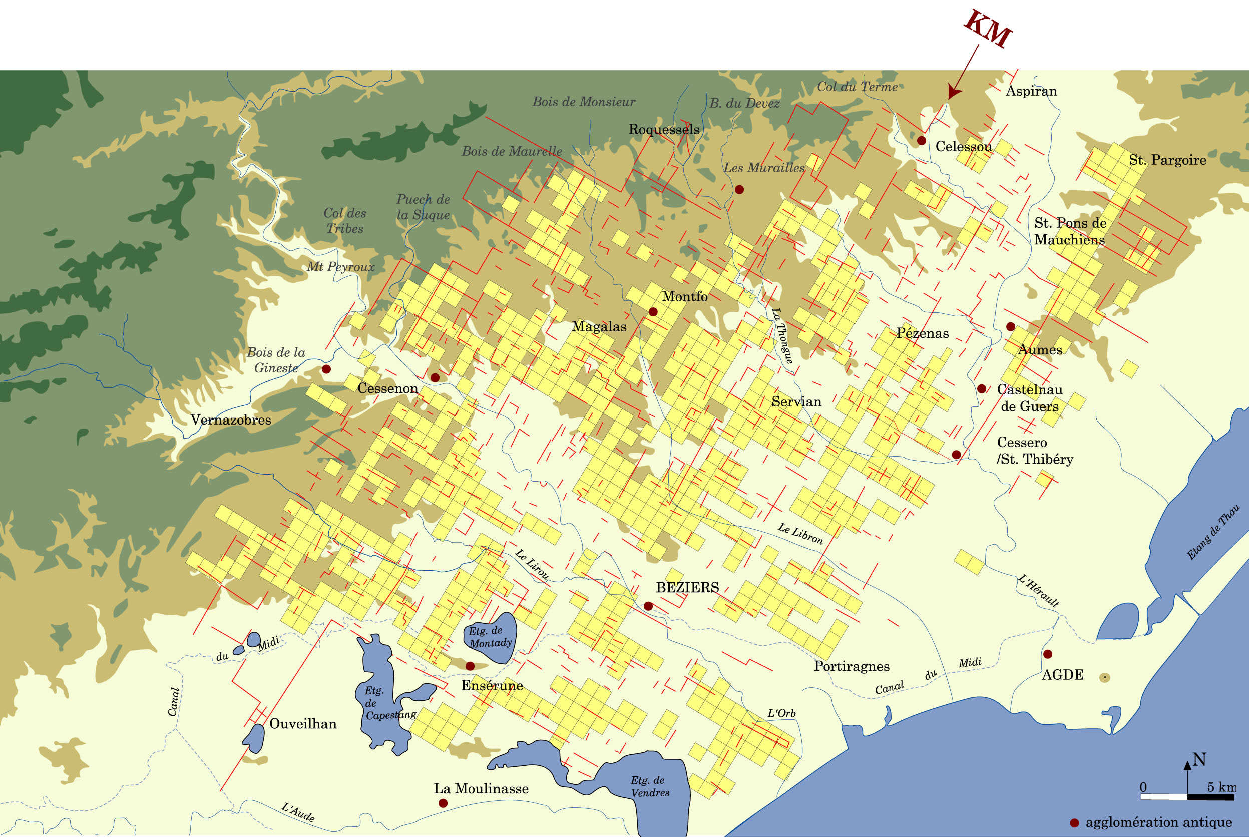 Les alentours de Béziers, fortement marqués par la centuriation, ont connu d'importants changements fonciers à partir de l'époque impériale, jusque dans le haut Moyen-Age. Ainsi l'archéologie et les cartullaires médiévaux ont gardé le souvenir d'une forte occupation du sol.