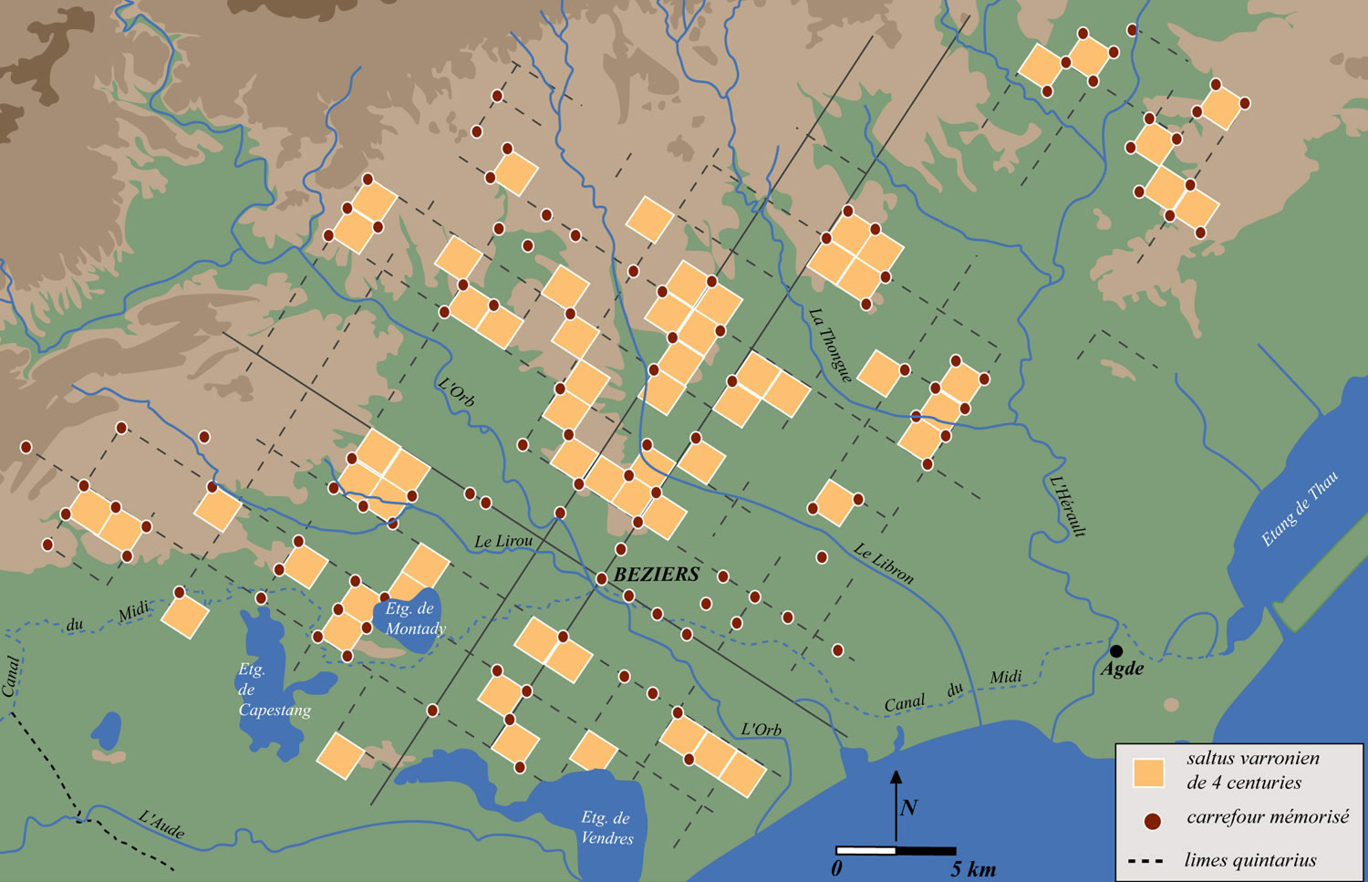 Il s'agit d'une centuriation classique dont le module de 20 x 20 "actus" correspond à une maille carrée de 705m et dont l'orientation a été mesurée à N32°30 E. Cette limitation, qui prend en écharpe le Biterrois et se coule dans l'orientation structurale du paysage, a particulièrement marqué le Nord du territoire. Elle se développe, avec une profondeur maximale de 45km et une largeur qui varie entre 30-35 et 5-6km. Le plan d'occupation des sols fait ressortir deux caractéristiques importantes. D'une part il présente un fort déséquilibre entre l'arrière-pays et les terres de la façade littorale. D'autre part il montre une densité différentielle du tissu centurié avec des discontinuités et des trous.