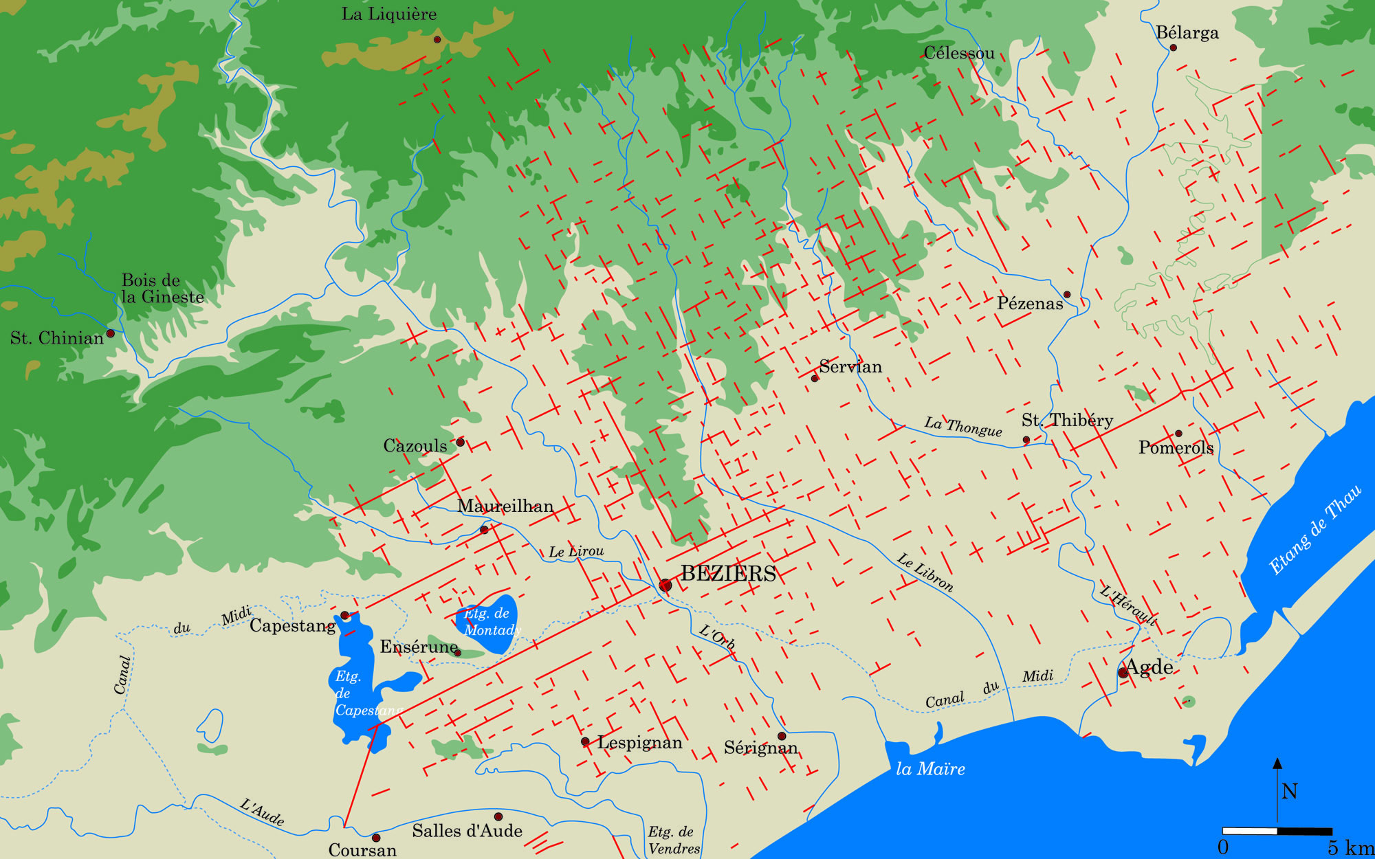Beziers tracesisocl centurB 100x96Effectuée en 1984, une prospection thermique aéroportée a révélé dans le sud Biterrois de nombreux tracés de drainages isoclines au réseau Béziers "B" entre les deuxième et troisième "kardo ultra kardinem" et liés à un habitat occupé dès le début du Ier siècle avant notre ère.
