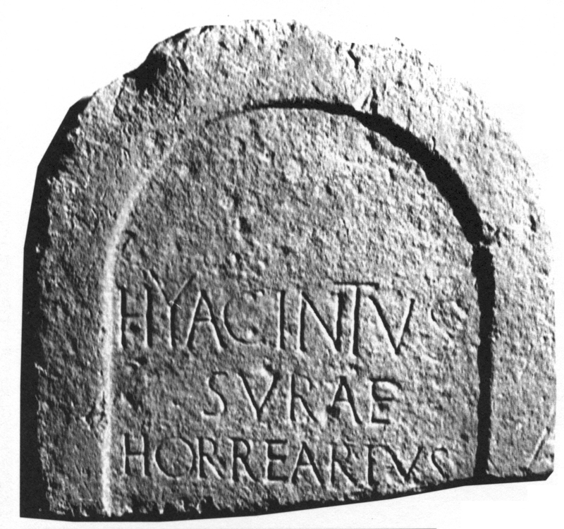 Il s'agit du CIL II, 2991, dédicace votive au génie de l'approvisionnement, le "genius horrearius", aujourd'hui disparue, et de l'épitaphe représentée ici, encore inédite, qui porte à notre connaissance l'existence d'un esclave, "horrearius", nommé Hyacintus.