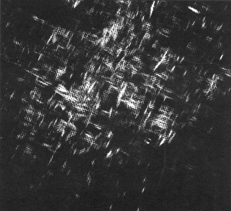 Commentaire | Révélée ici par un filtrage optique, la centuriation III de Caesaraugusta a le même module et la même orientation que la centuriation I, seule leur différence d'extension géographique permet de les distinguer. Elles sont considérées comme contemporaines. La centuriation III est en effet très réduite et relativement excentrée par rapport à la ville moderne de Saragosse. |