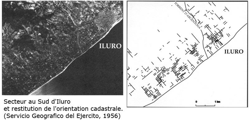 Dans cette centuriation de 20 x 20 "actus" avec un module mesuré à 710 m, on a observé deux centuries presques complètes. L'une se situe entre les "kardines" 7 et 8, dans le secteur du lieu-dit "Pla del Boet", l'autre entre les "kardines" 15 et 17. Le document photographique et la restitution du parcellaire de cette région montrent que l'orientation générale des axes correspond à la pente naturelle, ce qui assure un bon drainage du territoire. Elle se confrome aussi à la ligne du rivage et l'établissement de longs axes cadastraux perpendiculaires à la mer n'est pas sans évoquer des "limites maritimes" (Frontin, "De limitibus", Th. 13).