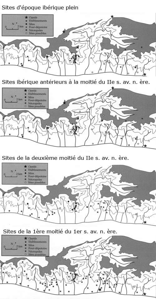 Au mileu du IIe s. av. n. è., Rome impose des mutations profondes : les "oppida" et certains des habitats de plaine et de piémont sont abandonnés tandis que Burriac devient un centre administratif et fiscal. De nouveaux sites d'habitat sont construits, de filiation indigène, mais on repère des éléments technologiques romains. Ce processus de "réinstallation" de la population indigène traduit l'extension des terres aménagées et une phase de mise en culture des zones basses. Les silos disparaissent au profit de "dolia" et les premières amphores à vin locales sont fabriquées, encore inspirées par la technique ibérique.