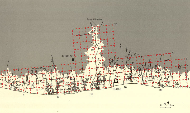 Commentaire | Au sud-ouest du site de "Can Soleret", où une limite de propriété antique bornée par des amphores de type "Pascual1" a été découverte, il est encore possible de lire la pérennité du parcellaire antique à l'époque médiévale. En effet, au haut Moyen-Age, la plupart des églises est construite sur les "limites" de la centuriation romaine. Leur emplacement, souvent des sites déjà occupés à l'époque romaine, et la toponymie témoignent de la permanence des axes de la centuriation romaine dans le paysage au moins jusqu'au Xe siècle. Entre Burriac et "Iluro" ce ne sont pas moins de 9 édifices qui sont concernés. |