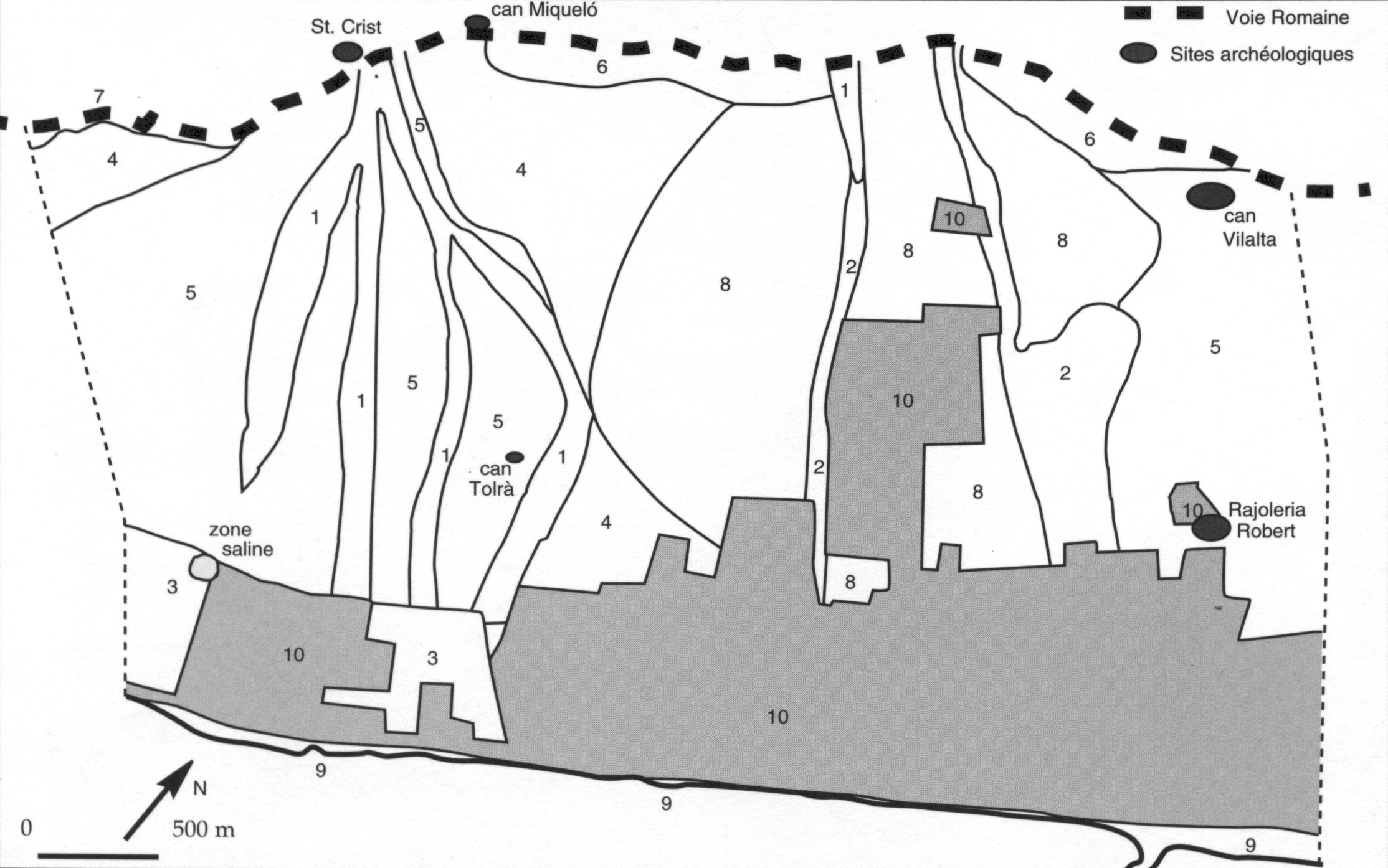 Dans le secteur de Vilassar de Mar, la faible densité de sites républicains précoces a été rapprochée des données de la carte pédologique. Celles-ci indiquent une qualité des sols médiocre, et une instabilité caractéristique des zones de cônes de déjection. Les sites se distribuent près des meilleurs sols (type 6 et 7) et le tracé de la voie romaine tient compte de la composition argileuse et de la présence de nodules de caliches, qui renforcent la résistance géotechnique. Les modalités d'occupation et d'aménagement de ce territoire attestent donc de l'intégration du facteur pédologique dans le projet d'implantation cadastrale.