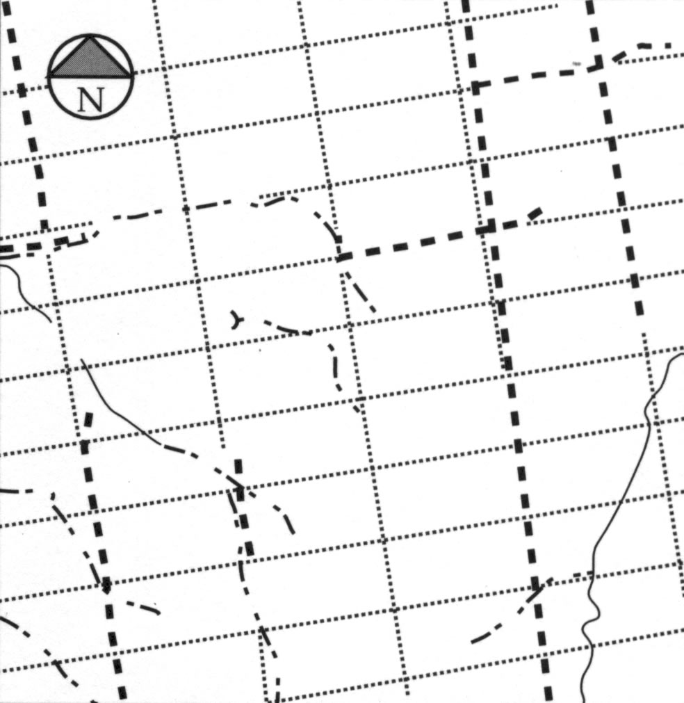 Ce schéma d'interprétation a été réalisé à partir d'une photographie aérienne verticale aux abords du village d'Almendralejo, situé à l'angle nord-ouest de cette restitution. A l'extrême Est du document, le tracé d'une voie romaine NO-SE est resté très pregnant dans le paysage : il constitue un des vestiges majeurs de l'ensemble de ce réseau cadastral, un "limes", mémorisé sur plusieurs kilomètres. L'interprétation des photographie recoupe les données des textes gromatiques à propos des "praefecturae" : il s'agit ici de centuries de 40 sur 20 "actus", (Hygin l'arpenteur, Th. 136).