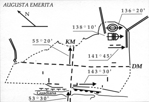 En l'état des connaissances archéologiques, il semble bien que le plan urbain de la colonie n'entretient aucun lien avec la centuriation attestée. En effet, la voierie et les îlots urbains ont une orientation qui oscille entre NG 50°30' et 55°15', orientation imposée par le cours du fleuve Guadiana. Par contre le cirque, qui est situé "extra muros", a reçu sensiblement a même orientation que le cadastre (N 87° 45' E). Il constitue actuellement l'unique vestige connu au nord du Guadiana qui puisse être rapproché de l'organisation territoriale décrite par les auteurs gromatiques.