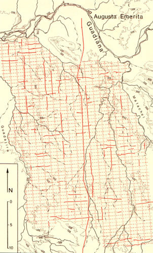 La colonie "Augusta Emerita" a été fondée en 25 av. n. è. par le légat Publius Caisius pour les vétérans des légions "V Alaudae" et "X Gemina". La structure du territoire colonial est extrèmement bien documentée par les sources gromatiques (Hygin l'arpenteur Th. 135-136, Frontin et Agennius Urbicus Th. 44). La "pertica", orientée selon les points cardinaux, était divisée et attribuée selon des centuries rectangulaires de 400 jugères, avec des "kardines" de 20 "actus" et des "decumani "de 40 "actus". De plus le territoire possédait des "praefecturae" et sa "pertica" s'étendait sur les deux rives de l'"Anas".
