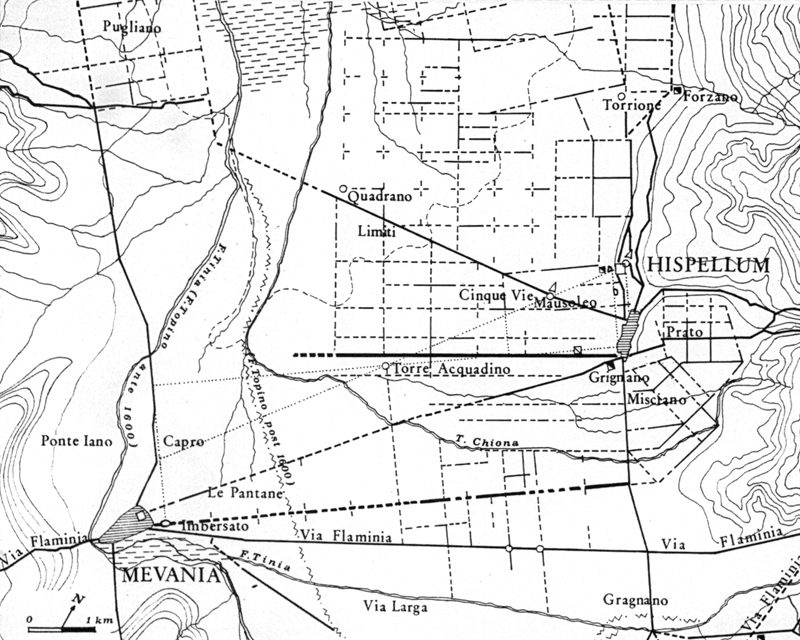 Dans l'aire de la centuriation suburbaine sont intégrés le monument funéraire situé près de Sainte-Marie du Mausolée - qui fonctionne comme gnomon" de la division centrale de cette zone - et la villa romaine de Casa Silvi avec son domaine. Le monument funéraire implanté le long de l'ancienne route Hispellum-Urvinum Hortense (///// V S . M . F/ EX . D . D. VIAE . SVBSTRVCTIONEM/EX PECVN . LVD . FACIEND/ CVR . IDEMQ . PROB = CIL. XI 5277) détermine l'alignement.