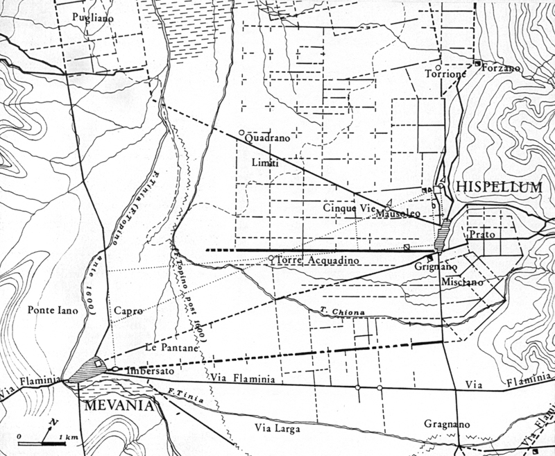 L'axe de structuration de la cité et du territoire semble partir du centre de la plaine et forme en même temps la frontière entre la "pertica" d'Hispellum et celle de Mevania. Les arpenteurs ont assigné 5 centuries de 706m en direction d'Hispellum (jusqu'aux murs de la Porte Urbica) et autant dans la direction opposée jusqu'à la route qui conduit de Mevania à Vettona. L'opération de division du territoire a été menée selon la technique de la "varatio fluminis". Malgré les grands travaux de bonification du XVIe siècle, on peut encore repérer des traces de "limites" et de "rigores" dans la partie orientale. On peut affirmer qu'entre les cours d'eau Chiona et Topino, de part et d'autre de la Via Flaminia, subsiste un réseau centurié construit sur un module de 20 "actus" lié pour une raison inconnue à l'orientation d'ensemble de la cité-sanctuaire d'Hispellum mais non à sa "pertica". L'épigraphie (CIL XI 5275) témoigne de la présence de colons militaires sur le territoire mais non du statut de colonie pour la cité.