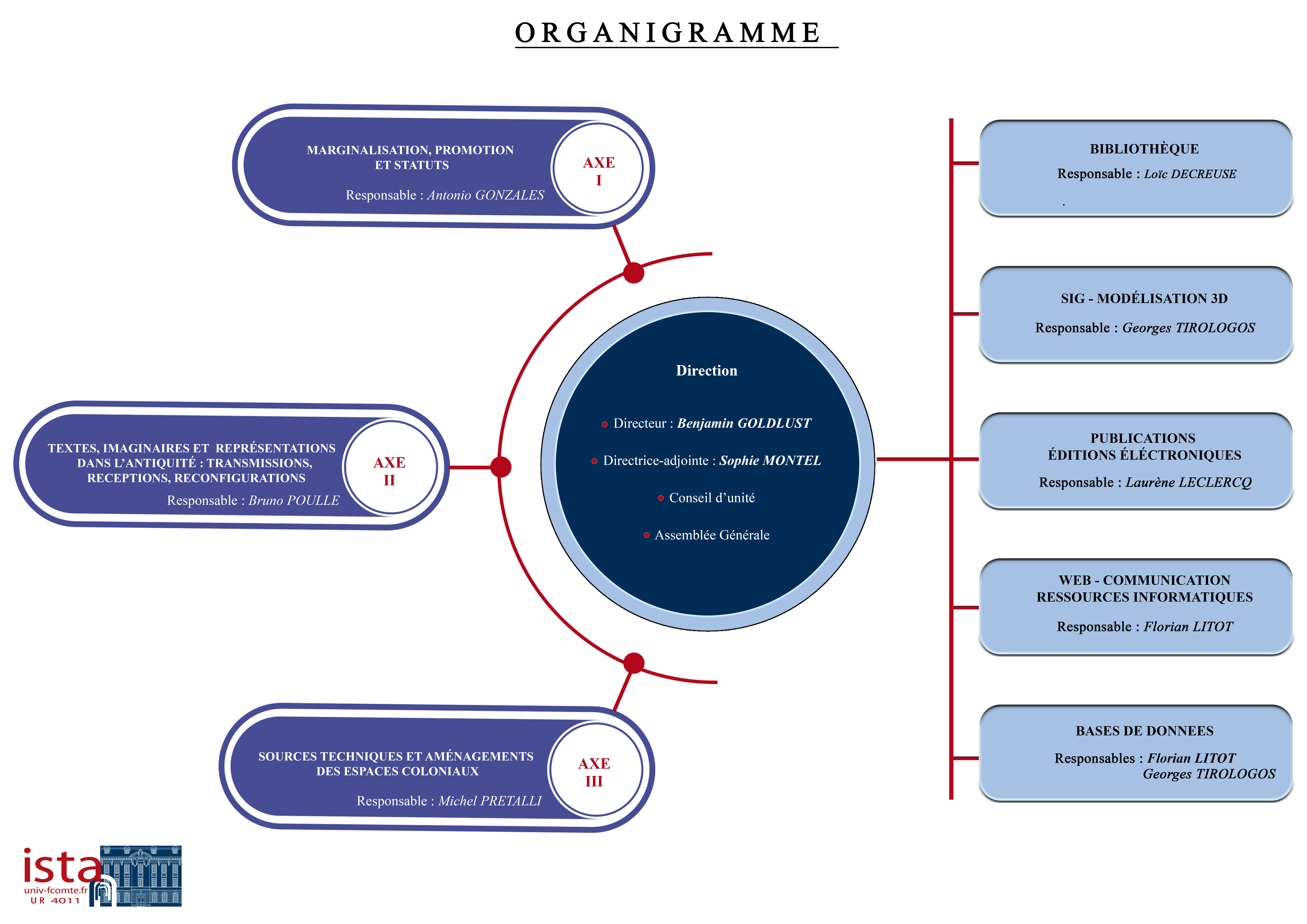 L’ISTA structure ses recherches autour de trois axes déclinés en deux opérations chacun. On y retrouve les questions d’histoire sociale et de leur transmission littéraire et épigraphique, les sources littéraires et religieuses dans la construction des imaginaires antiques et modernes, les territoires et les sources scientifiques et techniques qui permettent leur compréhension et leur analyse.